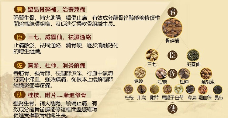 骨痛康中的特殊成分腰骨蛋白素強勁的藥效能迅速解除神經根的刺激和壓迫,消除神經、脊髓周圍的炎症和水腫,促進神經恢復,僵硬的脊梁就像冰柱得到了陽光的滋潤,疼痛酸脹馬上就止住了!